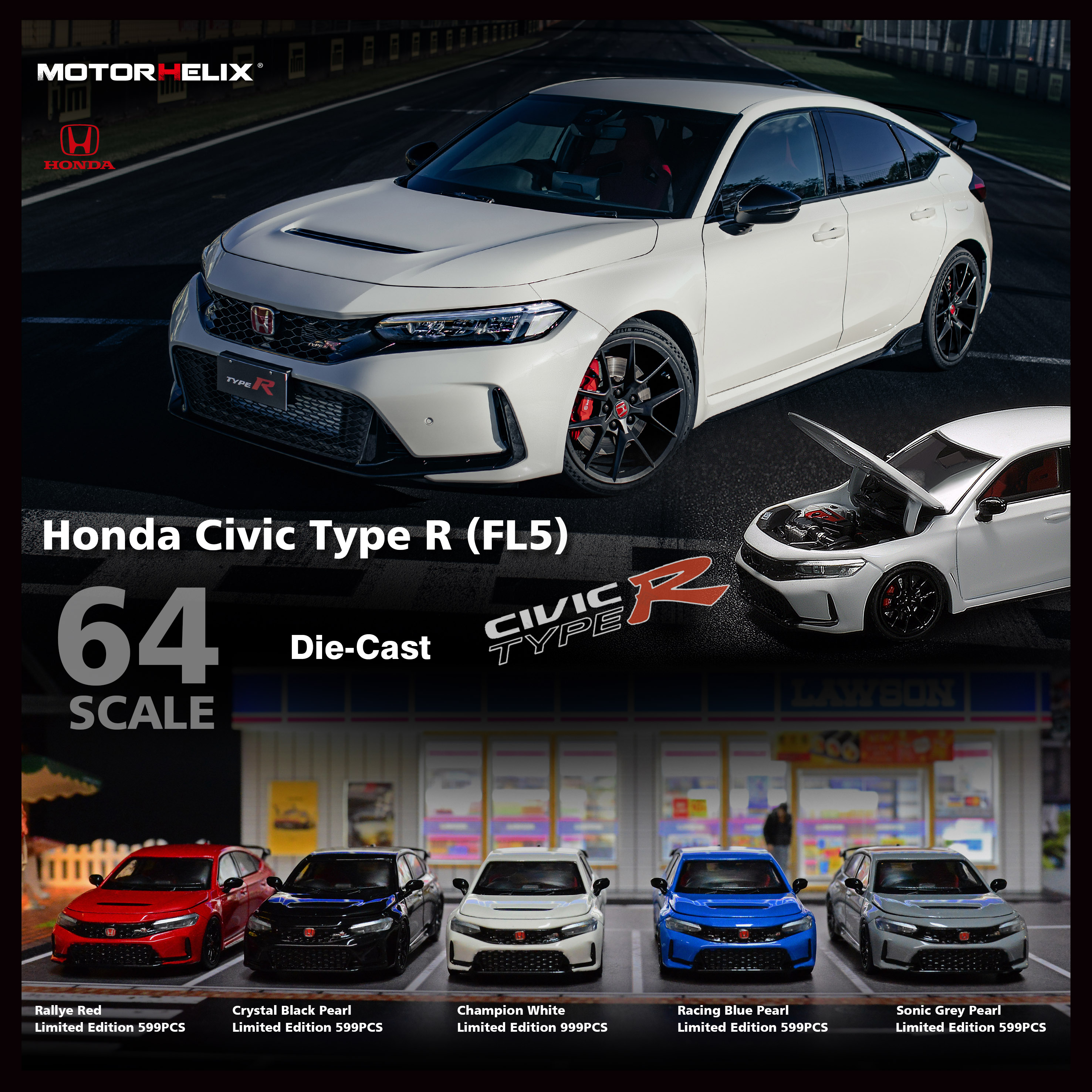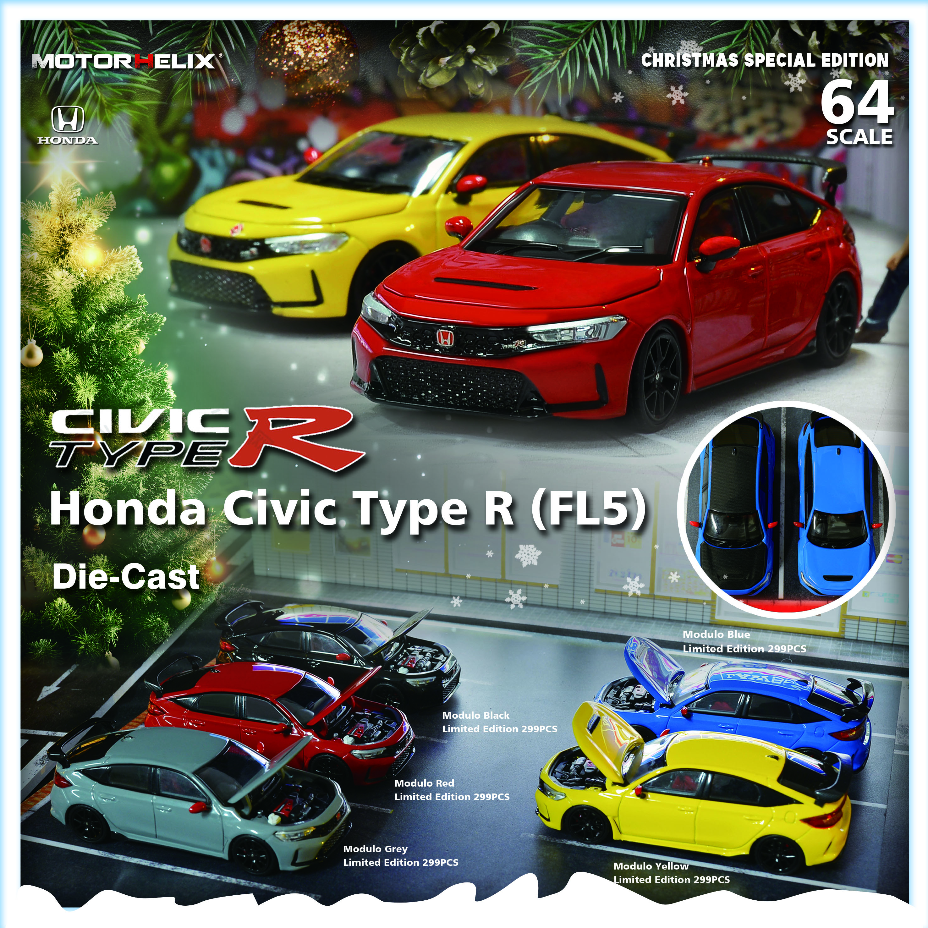 在欢乐的圣诞节来临之际, MOTORHELIX 将推出1/64 本田 Honda Civic Type R(FL5),合金汽车模型 圣诞节特别版本,Modulo--红色、黑色、蓝色、灰色 、黄色 分别限量299 台,零售价为158元。包装为底座+展示盒,还有圣诞节特别版彩盒包装,含独立限量号铭牌,红色后视镜/ 碳纤维尾翼,模型引擎盖可开启;并随车附赠金属车标水纸、头盖及车顶碳纤维水纸各2套,新增尾翼和尾翼左右支架电蚀片,由玩家自己安装,精美礼品快来为自己和朋友选购吧,为即将到来的节日添上色彩!