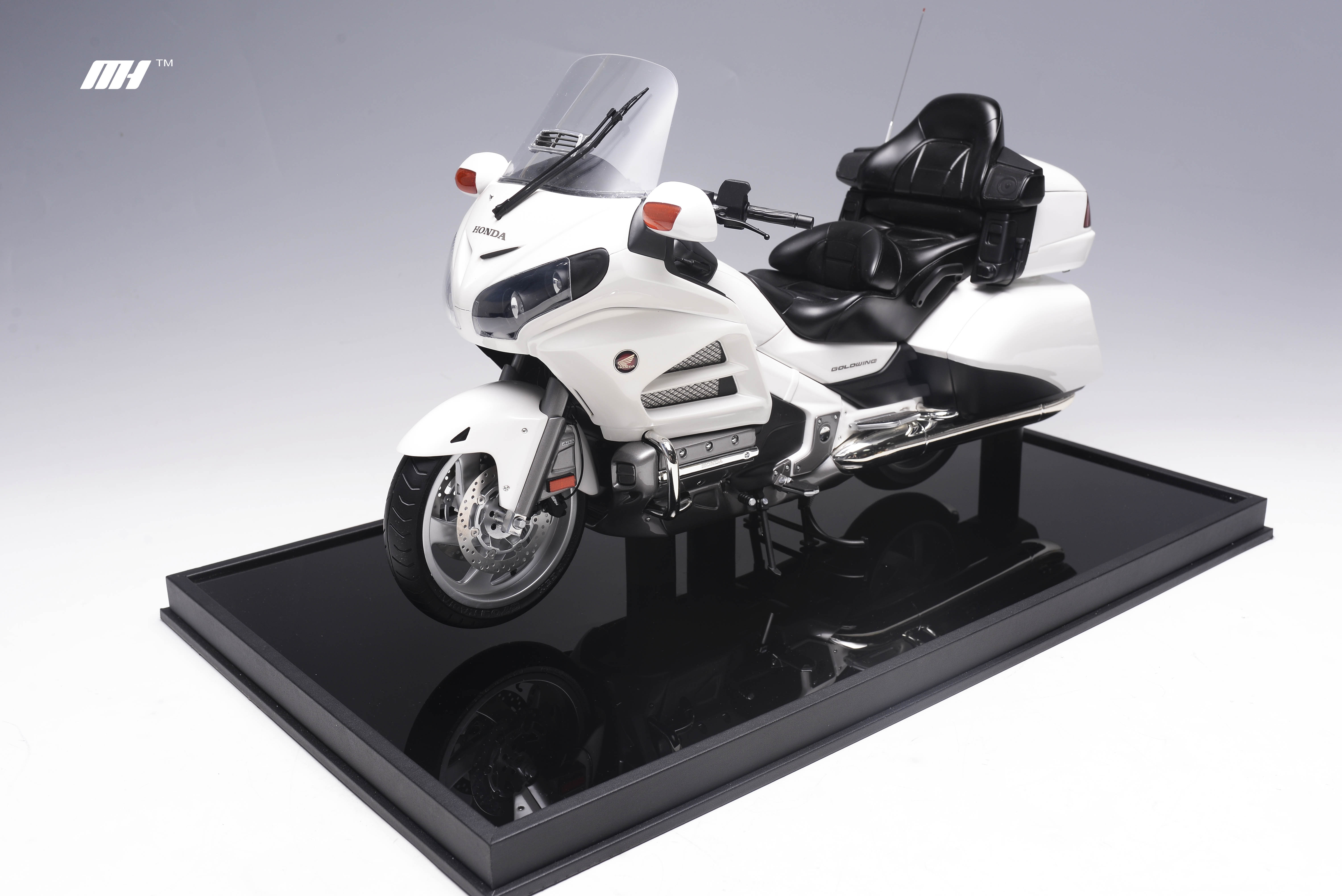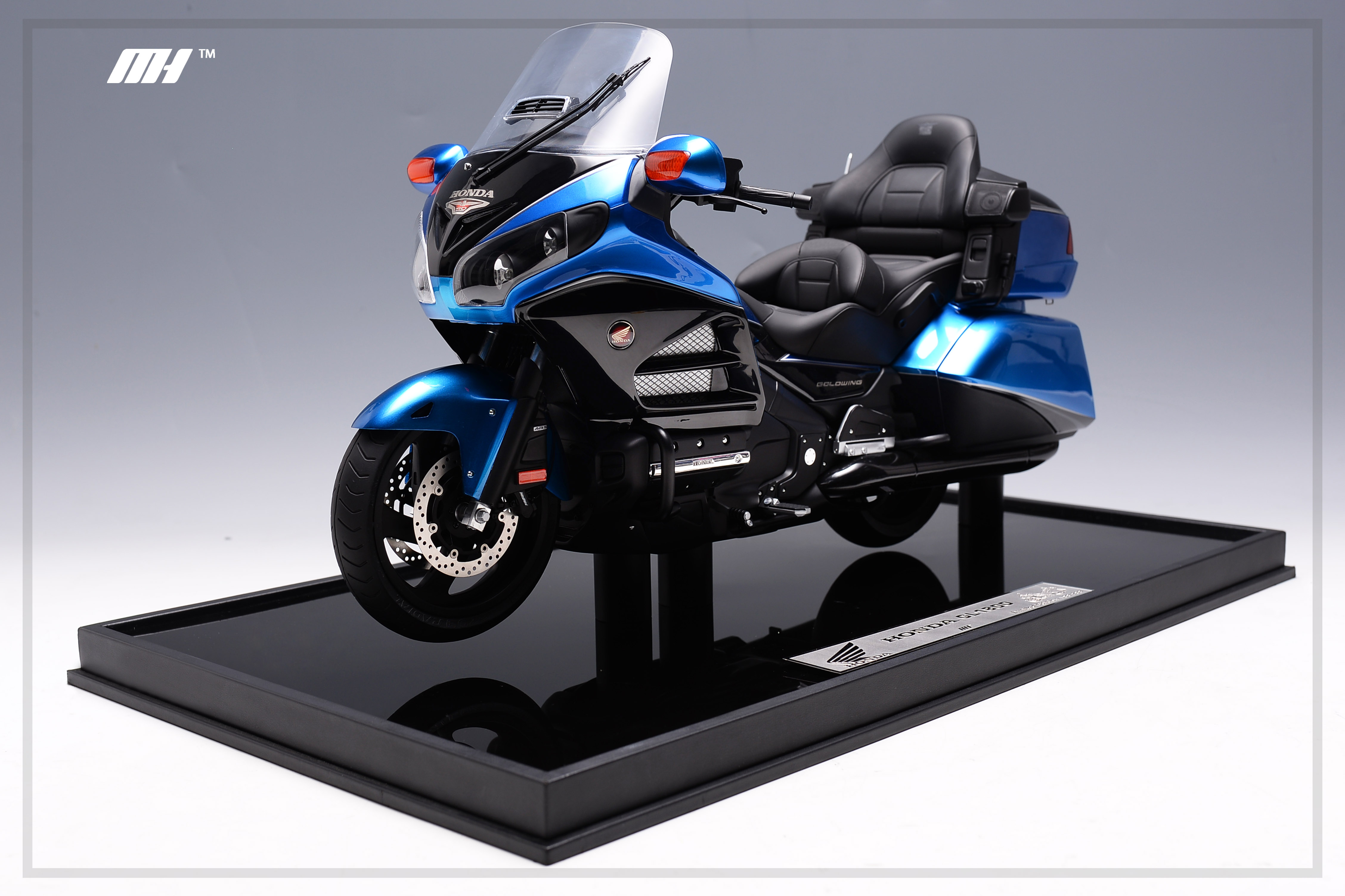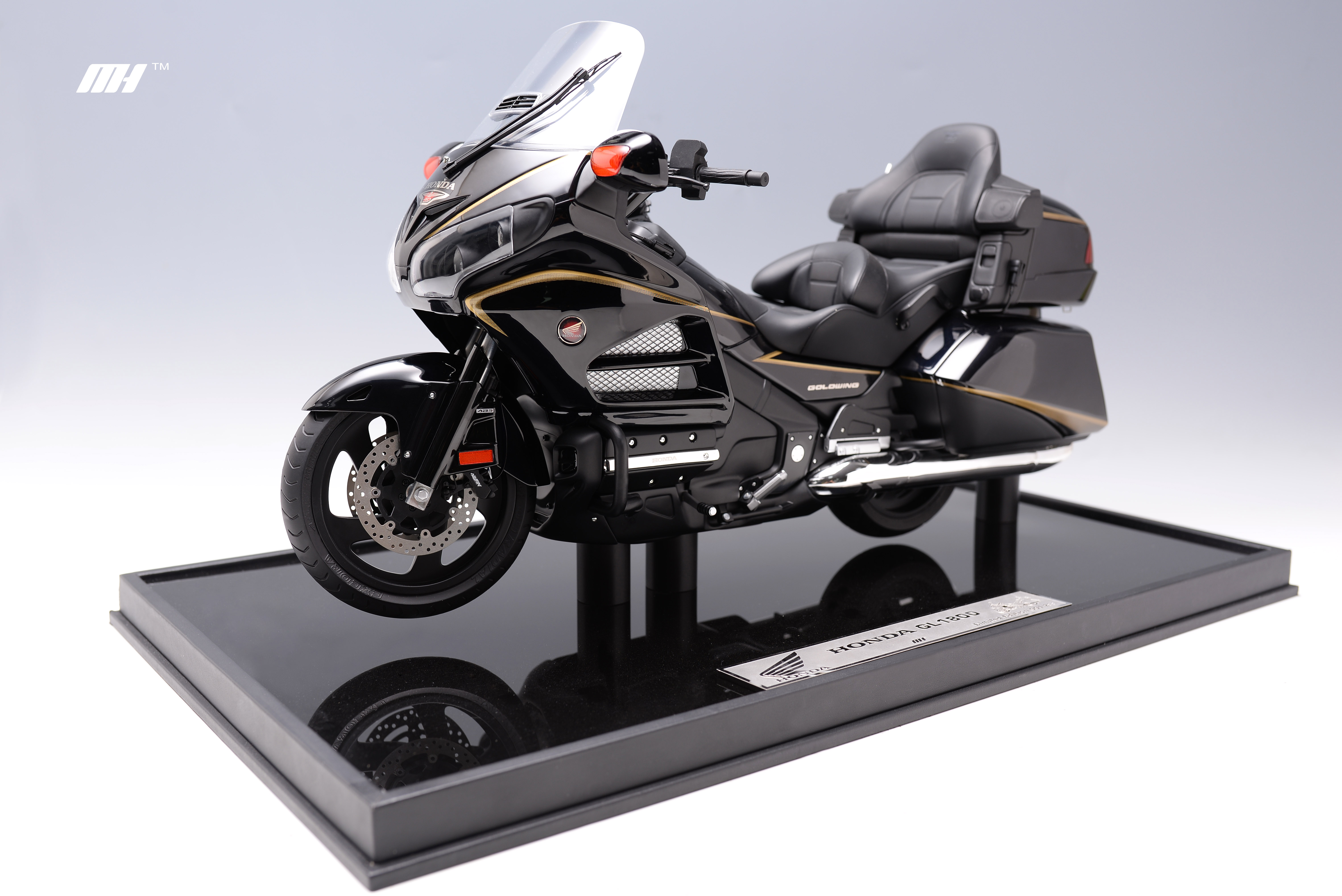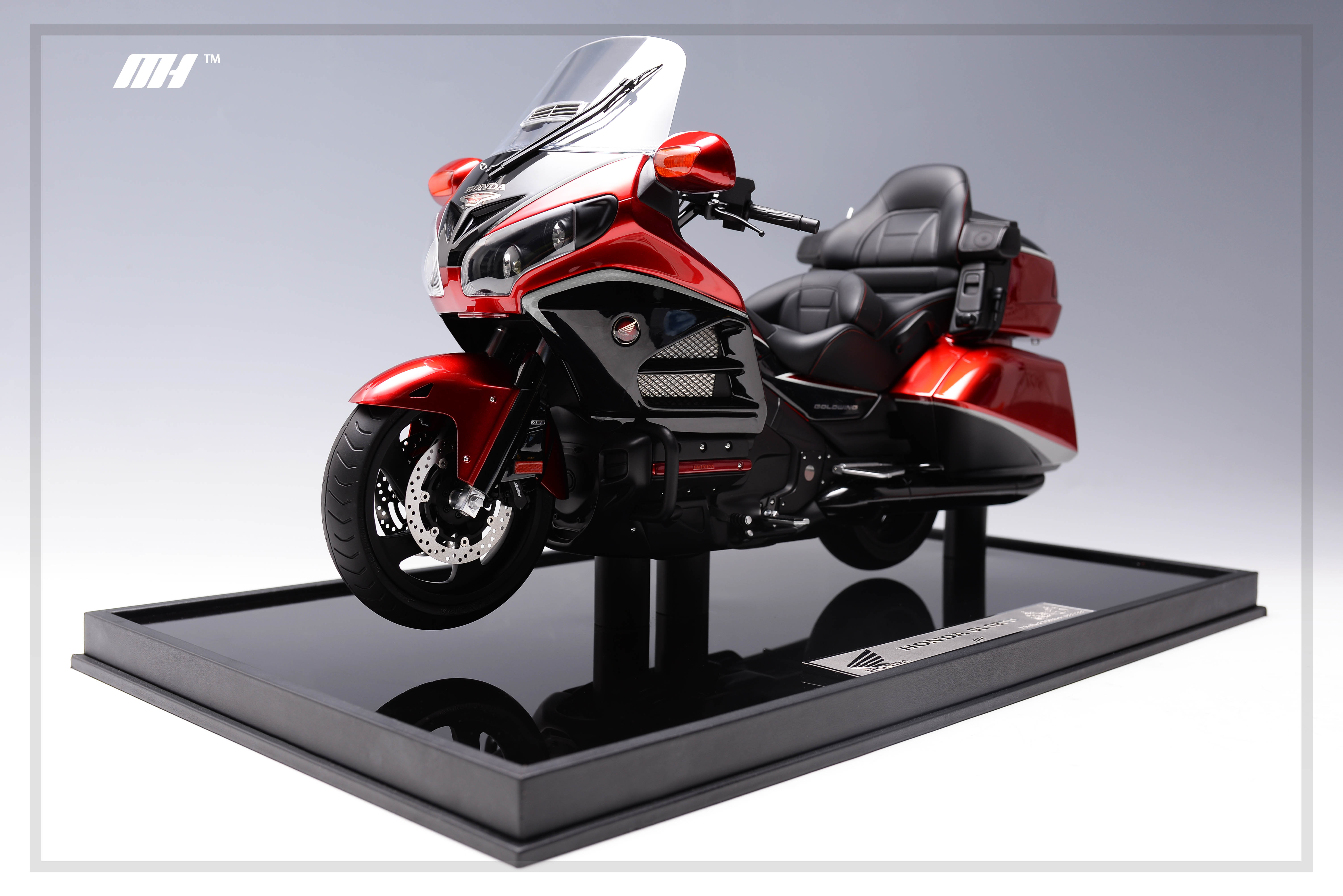 MOTORHELIX 1/6本田金翼GL1800摩托车,历时3年半的研发,通过对真车反复拍照测量,先后打版4次,进行一代又一代更新与创新,终于在春节前面世啦。本田金翼GL1800全车零部件超500个,复模件超180个(其中喷油件111件,电镀件超70个)、开模件22件、金属件超190个、磁铁20个、水贴103个、车身油管、电线采用了细胶管代替,多达13个,座椅为了达到最逼真效果,采用复模软胶工艺。金翼标志采用了金属水贴加上滴胶工艺。本田金翼每一个小配件都经过专业师傅的精雕细琢,由于车身过于庞大,防止车身变形,很多配件采用的是ABS材料。单喷油就有4道工序,打磨、喷底漆、喷面漆、再喷清漆,360度无痕抛光处理,以求达到最佳效果。